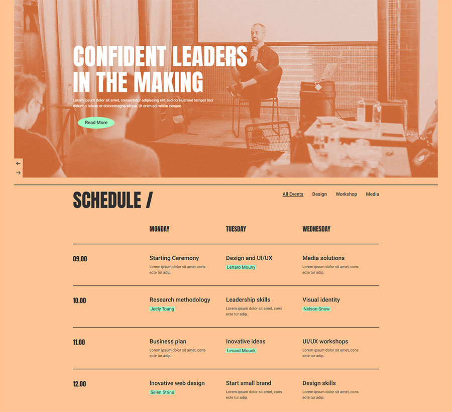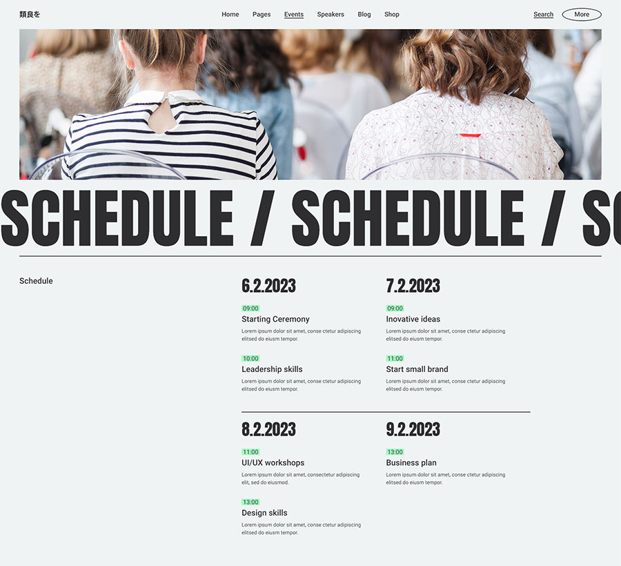 Prebuilt event schedule list template for featuring your events with additional info.